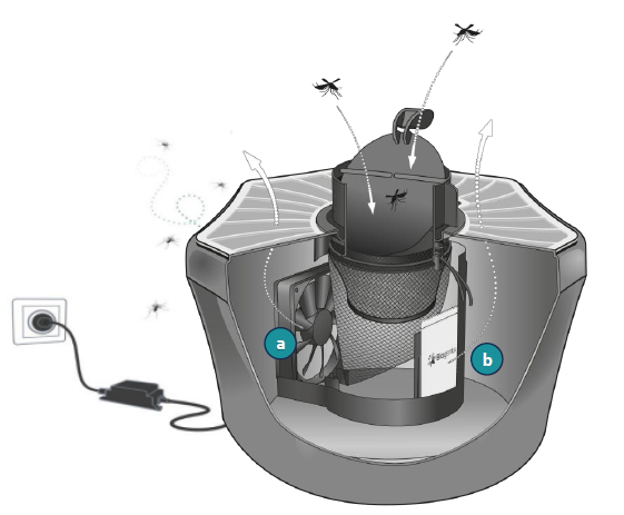 - El ventilador (a) difunde el atrayente (b) en el ambiente, imitando el olor humano, atrayendo y succionando a los mosquitos hacia la trampa, donde se deshidratan y mueren.